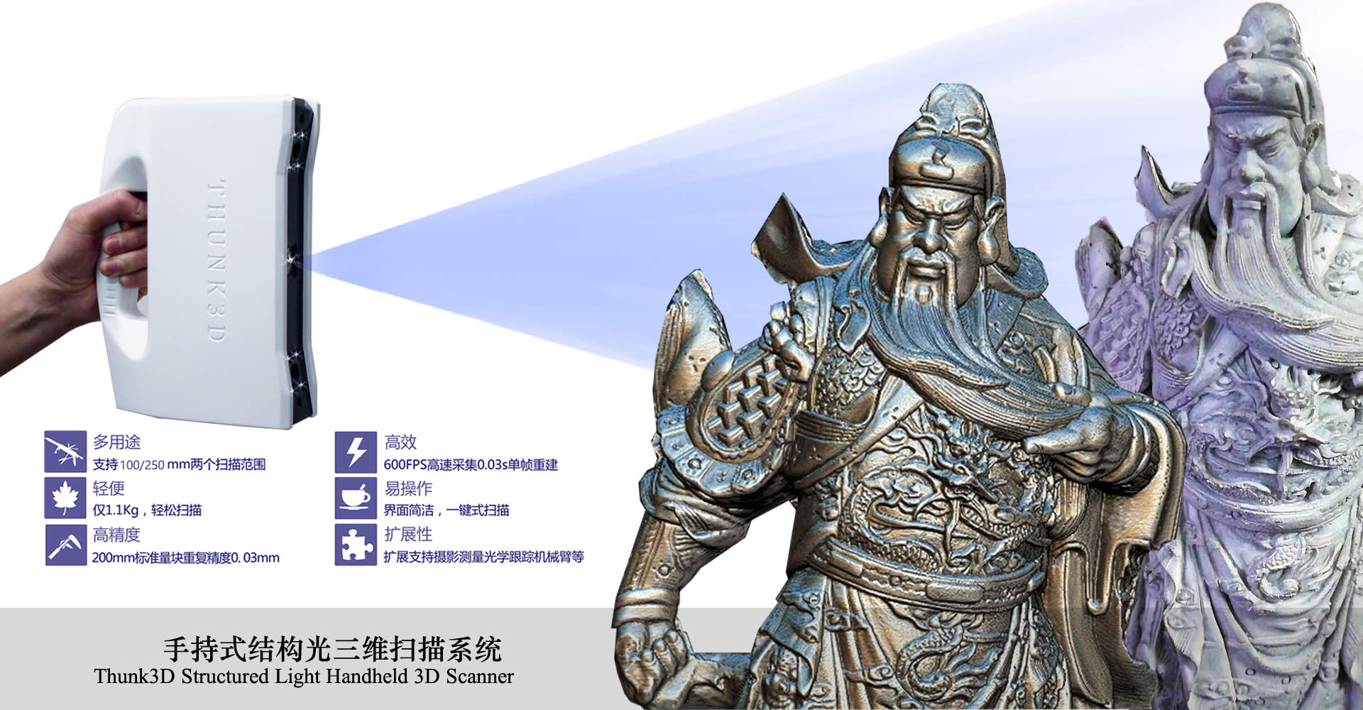 HSCAN-S是基于實時三維重建應用場景設計的高集成度易操作的手持式三維掃描系統,可實現0.03秒高速掃描并一鍵自動完成點云全局注冊,去噪融合,無損網格化,補洞,曲率抽樣生成STL標準三維格式。系統基